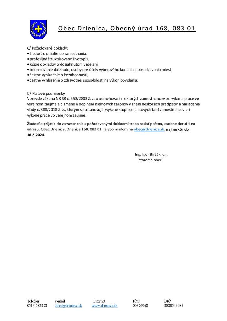 Voľné pracovné miesta - MŠ Drienica
