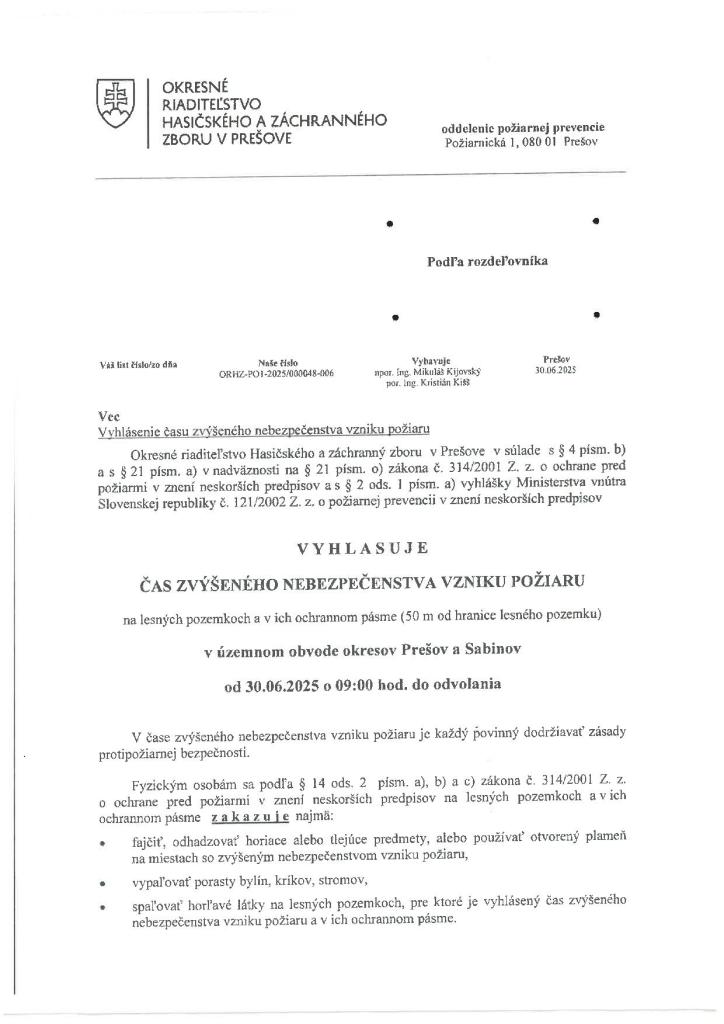 Vyhlásenie času zvýšeného nebezpečenstva vzniku požiaru.